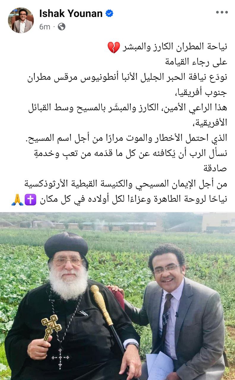 نعى الإعلامي إسحق يونان، نيافة الحبر الجليل الأنبا أنطونيوس مرقس مطران جنوب أفريقيا.